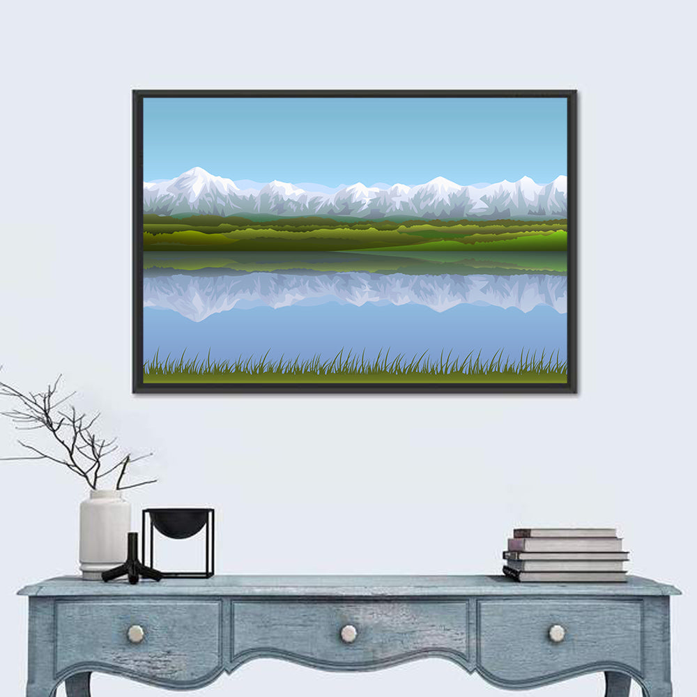 Whether you love art or just looking to decorate your home, this striking and powerful alpine landscape on the bank of lake wall art is an eye-catching decor element that can't go unnoticed. This art print by CanvasPiece is designed to resonate and spark a mix of feelings.