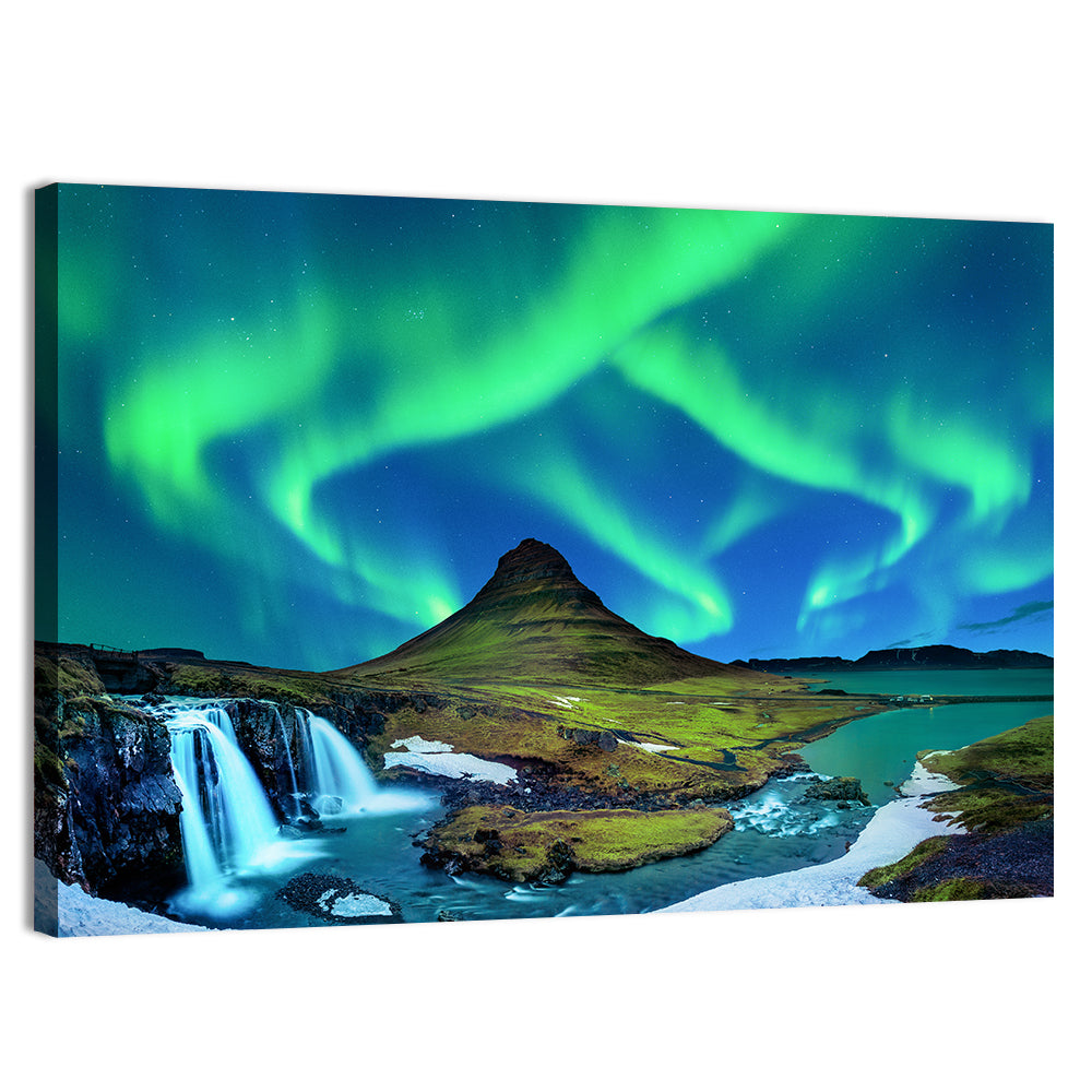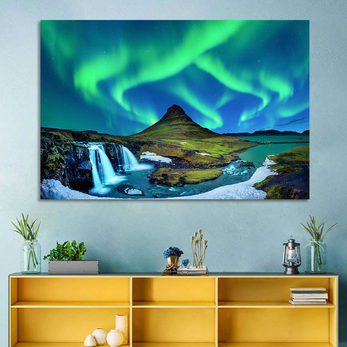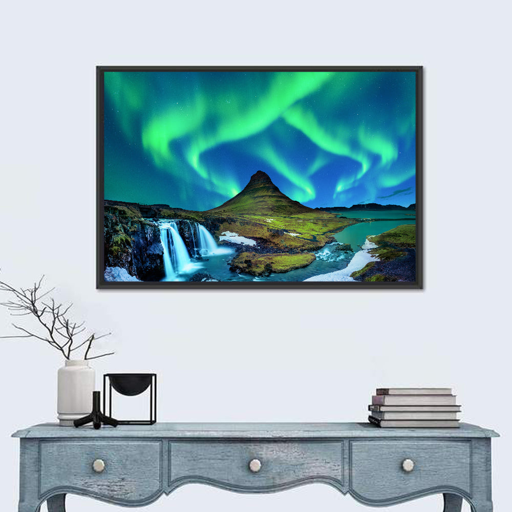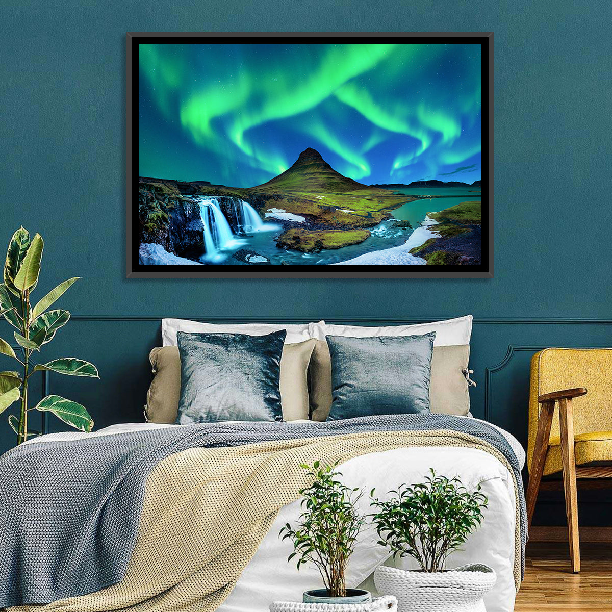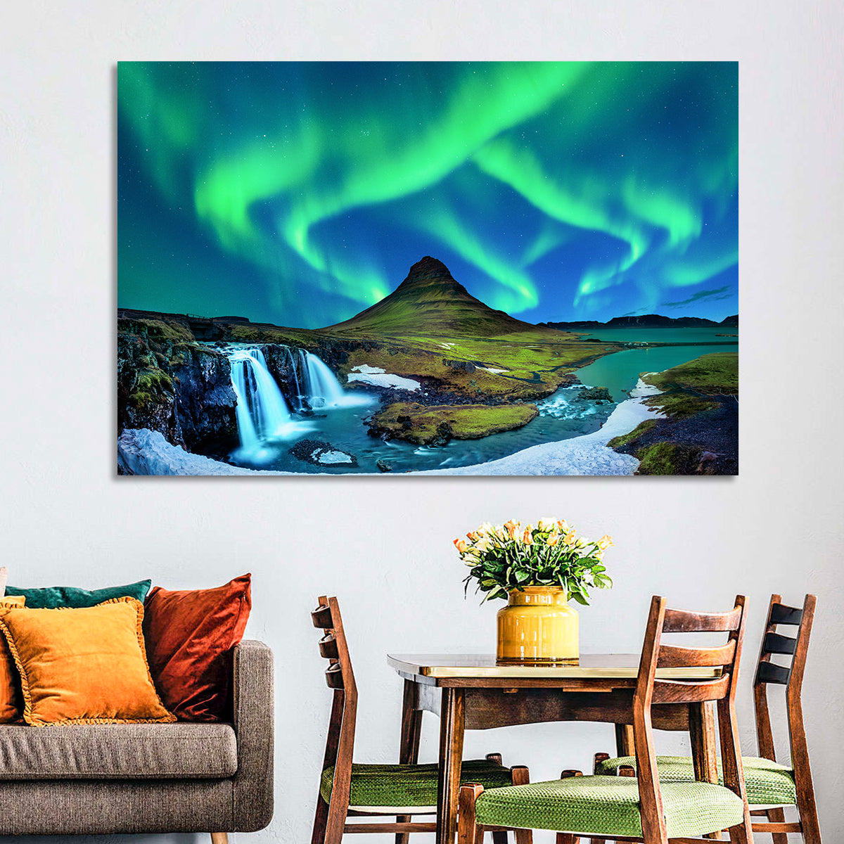 Whether you love art or just looking to decorate your home, this striking and powerful Aurora Borealis Kirkjufell Wall Art is an eye-catching decor element that can't go unnoticed. This art print by CanvasPiece is designed to resonate and spark a mix of feelings.