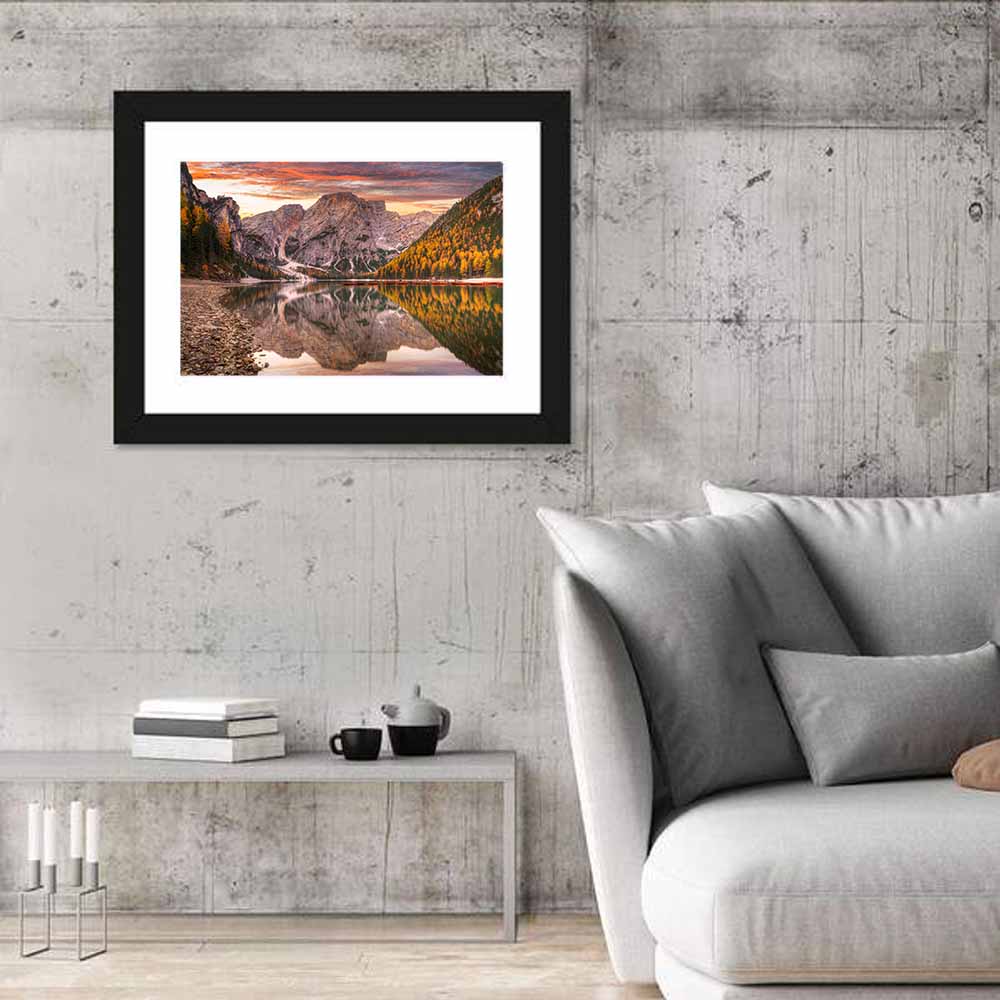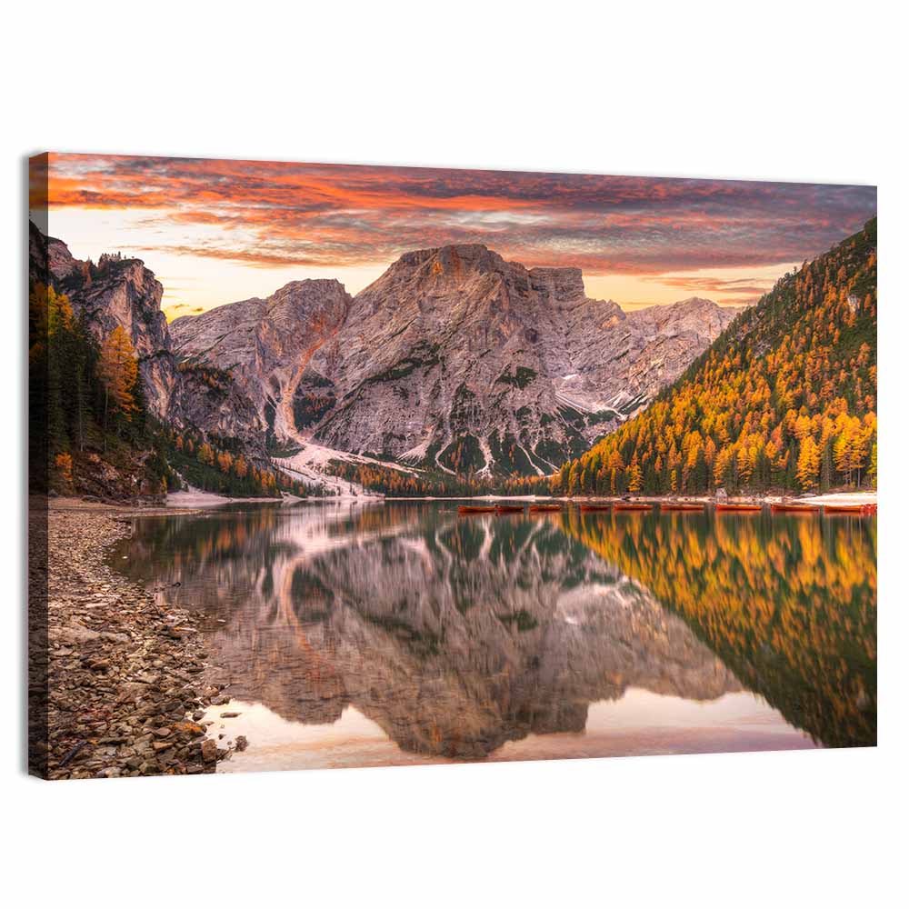 Whether you love art or just looking to decorate your home, this striking and powerful Lago di Braies lake and Seekofel peak at sunrise, Dolomites, Italy Wall Art is an eye-catching decor element that can't go unnoticed. This art print by CanvasPiece is designed to resonate and spark a mix of feelings.