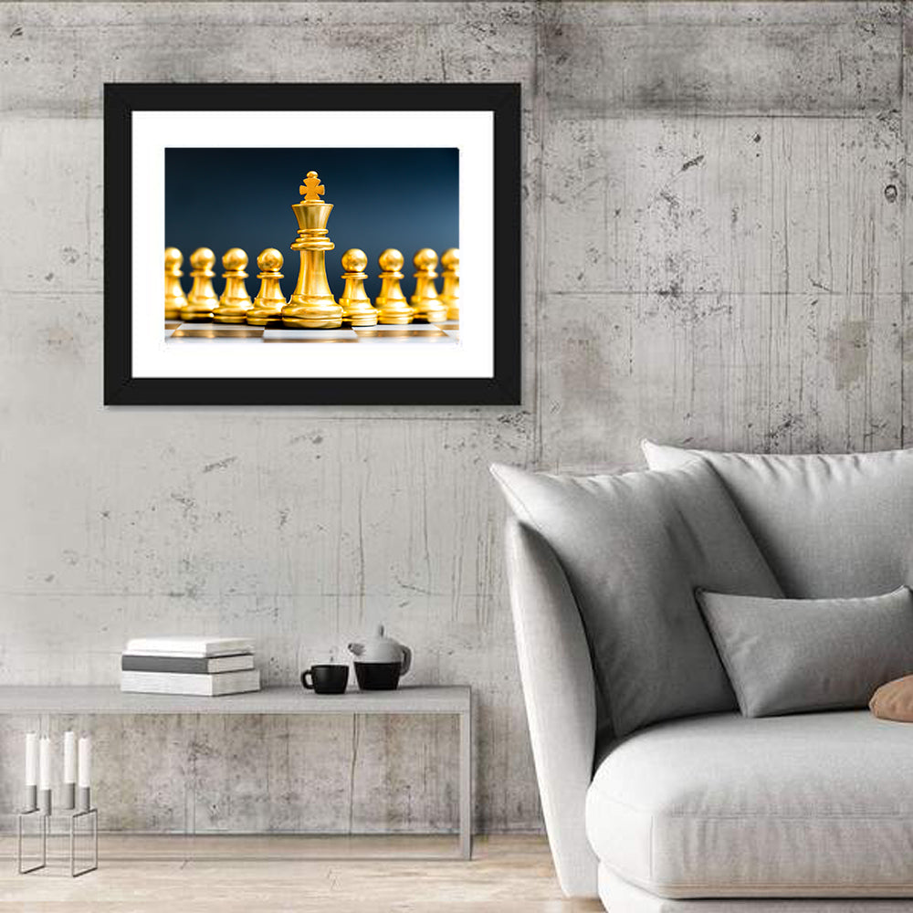 Elevate your home decor with the Gold King Chess Piece Wall Art by CanvasPiece. Featuring a striking and powerful gold king chess piece standing in front of a pawn, this art print is sure to catch your eye. With its unique design and emotional resonance, it's a must-have for any art lover or home decorator.