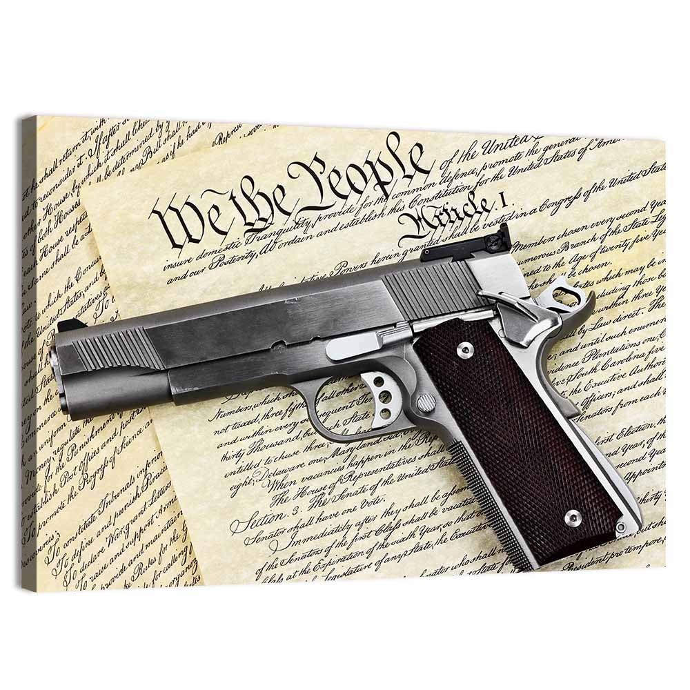 Whether you love art or just looking to decorate your home, this striking and powerful hand gun with US constitution Wall Art is an eye-catching decor element that can't go unnoticed. This art print by CanvasPiece is designed to resonate and spark a mix of feelings.