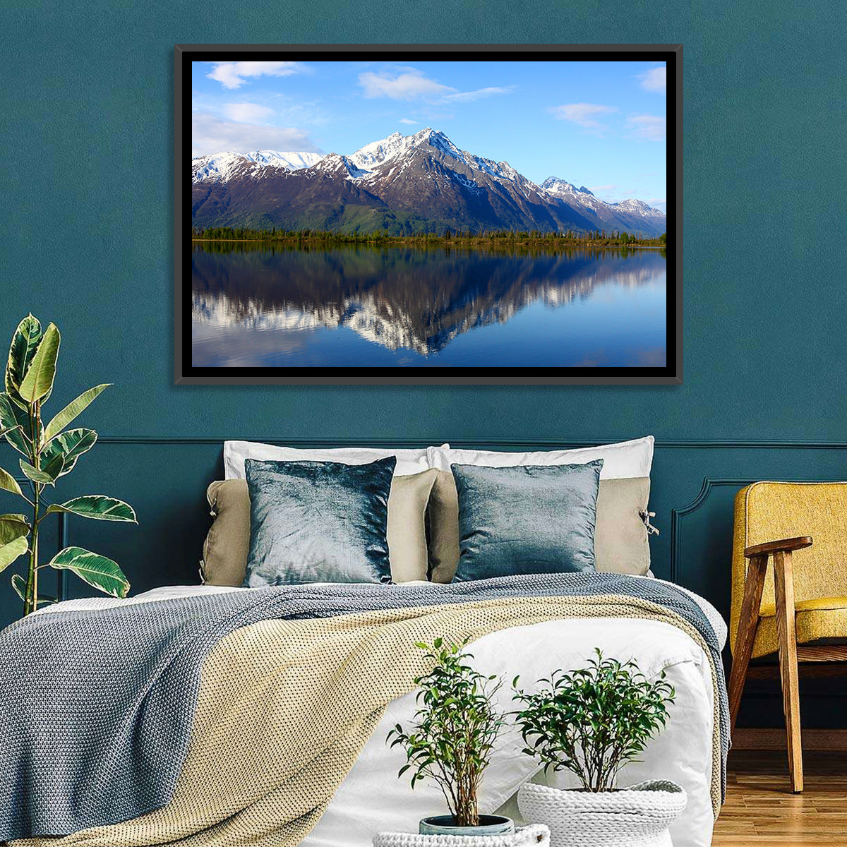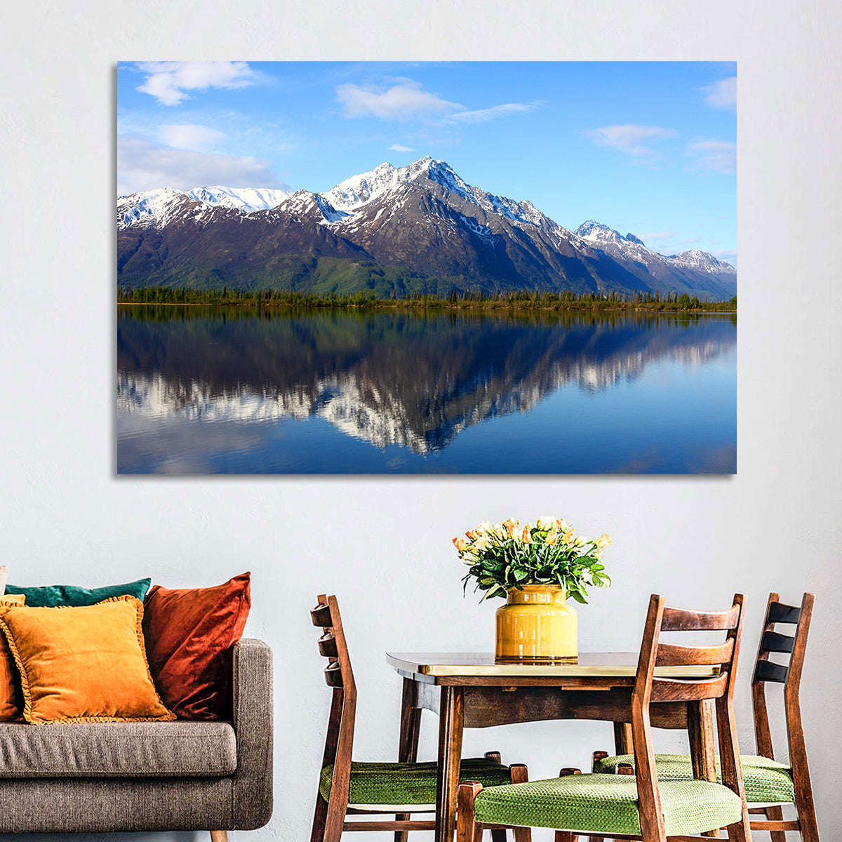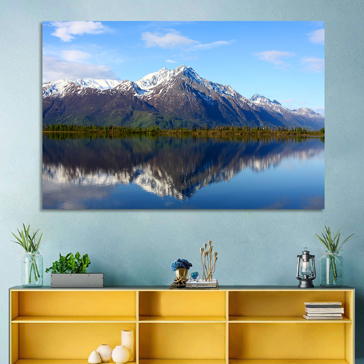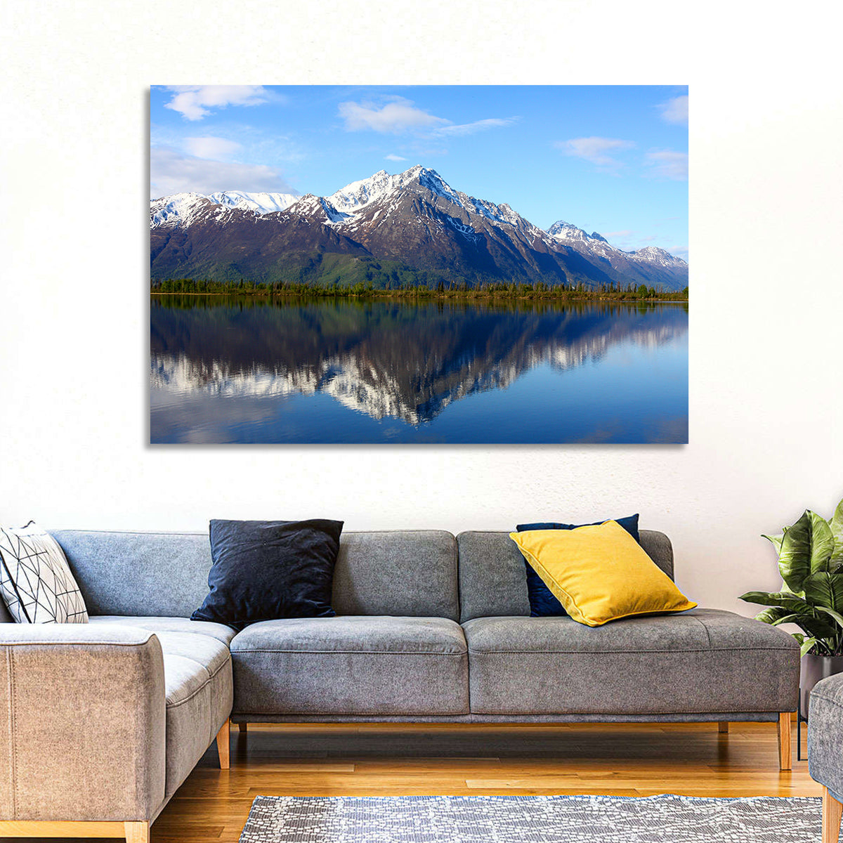 Whether you love art or just looking to decorate your home, this striking and powerful Pioneer Peak reflected in Jim Lake Alaska Wall Art is an eye-catching decor element that can't go unnoticed. This art print by CanvasPiece is designed to resonate and spark a mix of feelings.