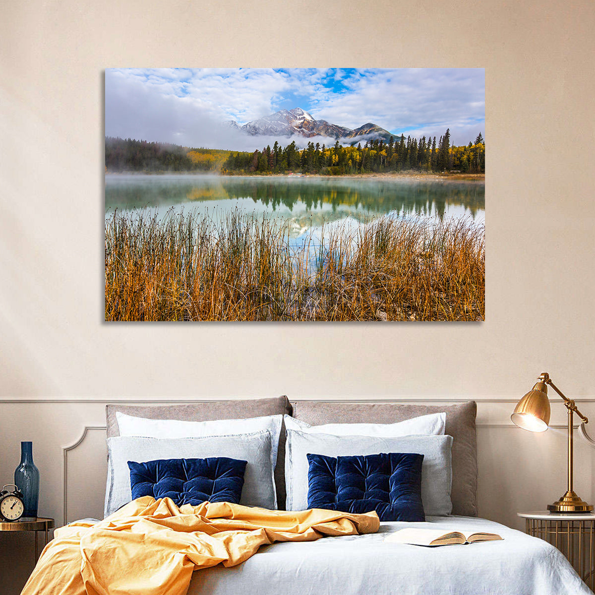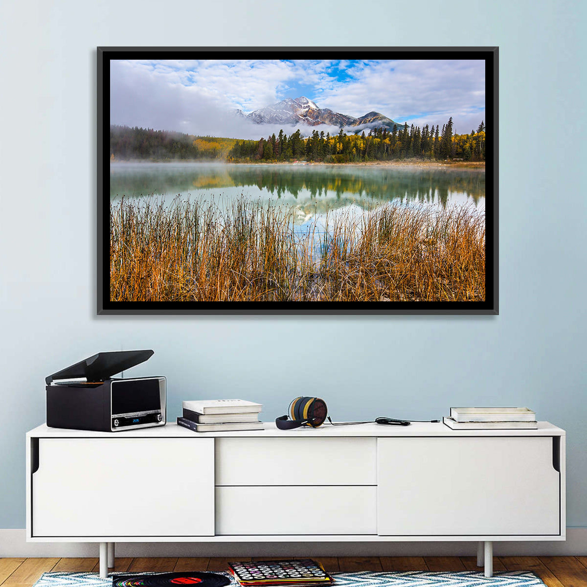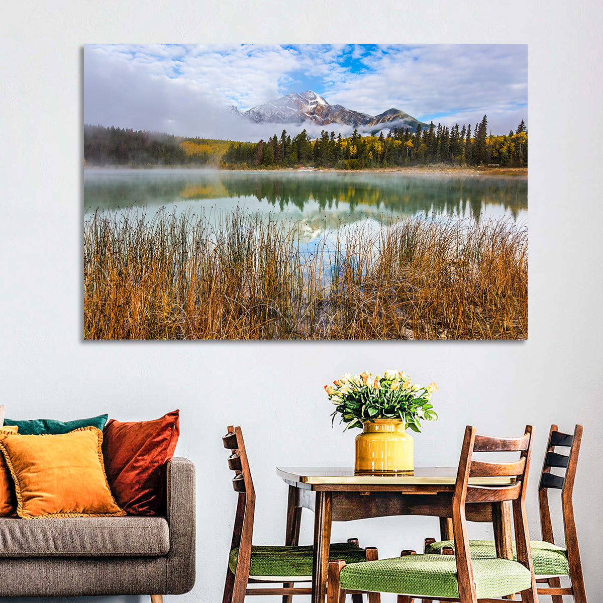 Whether you love art or just looking to decorate your home, this striking and powerful Patricia lake and Pyramid mountain Wall Art is an eye-catching decor element that can't go unnoticed. This art print by CanvasPiece is designed to resonate and spark a mix of feelings.