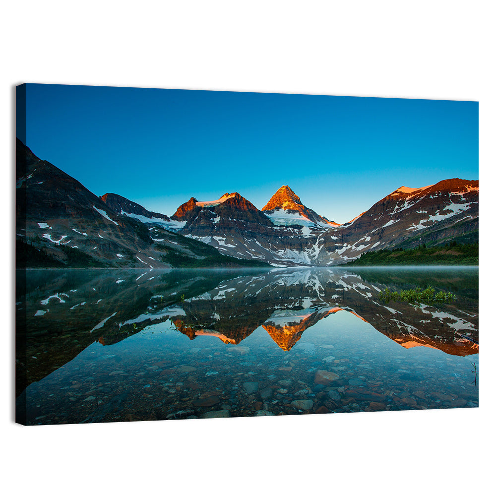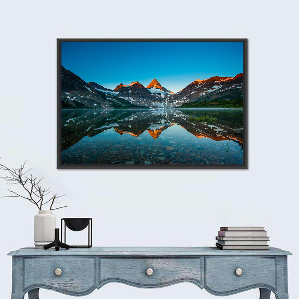 Add character to your space with this stunning Reflection of Mount Assiniboine Wall Art. The striking image of Mount Assiniboine on Magog lake at sunrise in Alberta, Canada is sure to catch the eye and evoke emotions of awe and tranquility. A perfect addition to any art-lover's collection or to elevate the decor of any room.