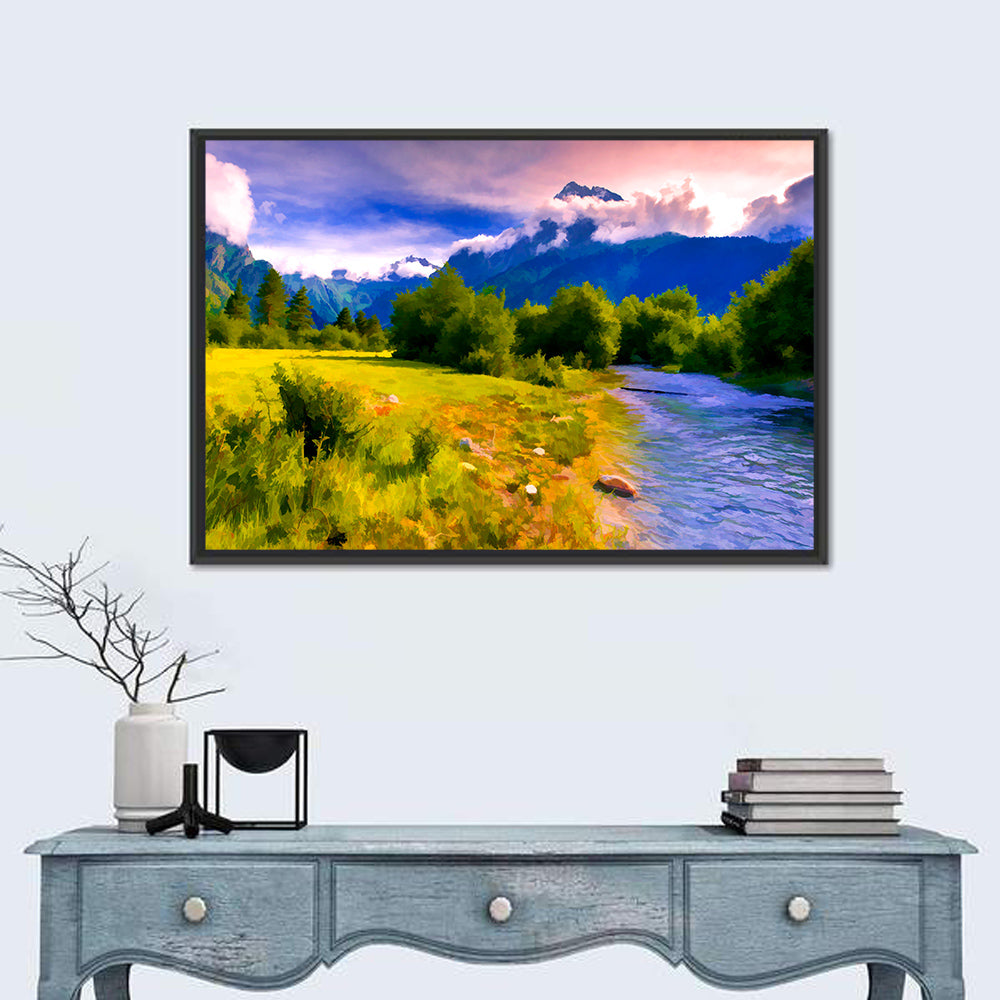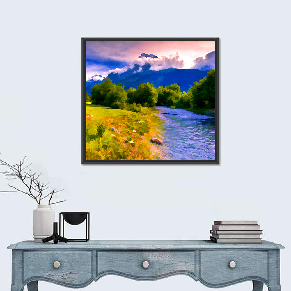 Elevate your home decor with our River In Mountains Artwork Wall Art. This stunning blue river in the mountains print is guaranteed to make a statement in any room. Designed by CanvasPiece, this art print evokes a mix of emotions and adds a powerful touch to any space.