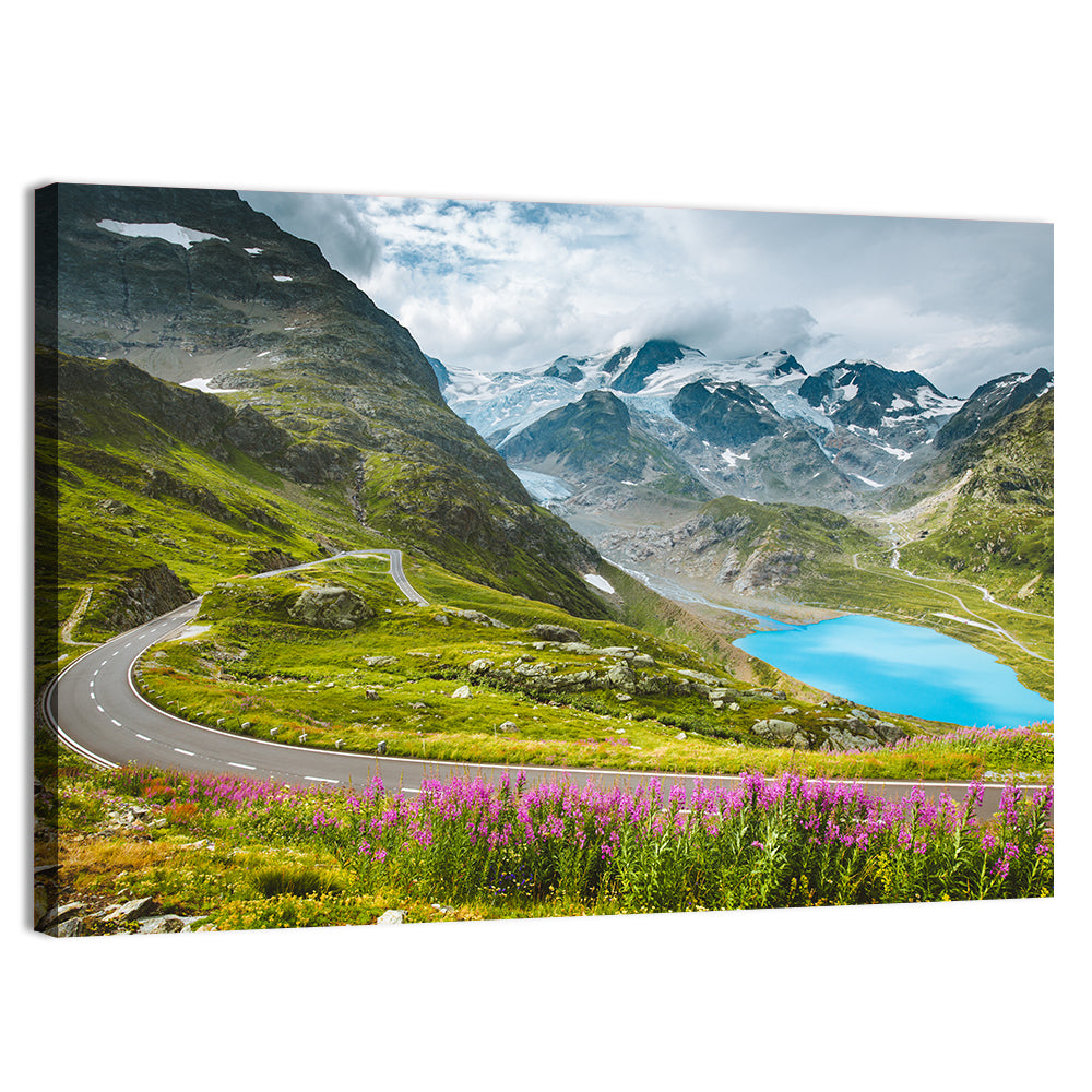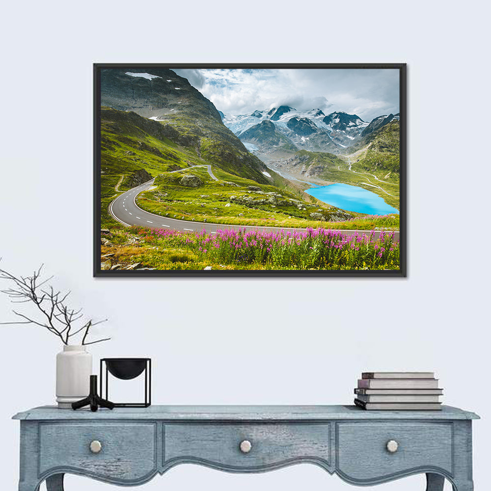 Experience the breathtaking beauty of the Swiss Alps with this striking wall art print. Featuring a winding road surrounded by majestic mountains, glaciers, lakes, and blooming flowers, this piece is an eye-catching addition to any home decor. Designed by CanvasPiece, it is sure to evoke a mix of powerful emotions in any art lover.