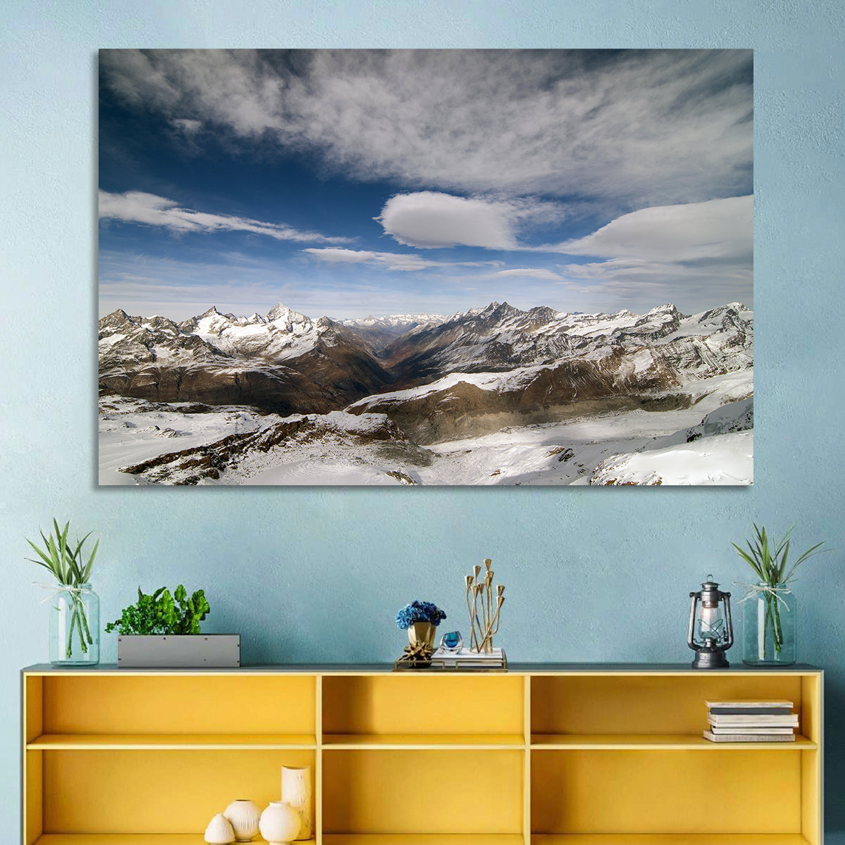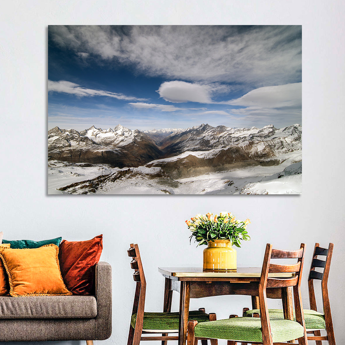 Whether you love art or just looking to decorate your home, this striking and powerful Snowy Alpine Mountains Wall Art is an eye-catching decor element that can't go unnoticed. This art print by CanvasPiece is designed to resonate and spark a mix of feelings.