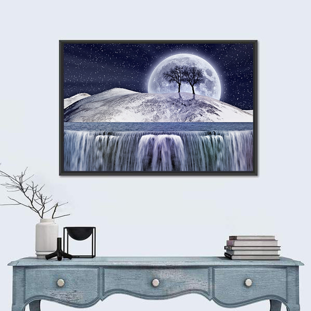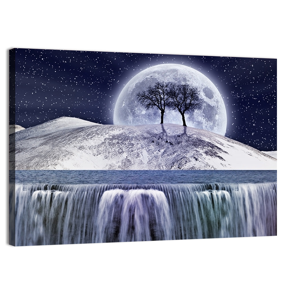 Waterfall & Snowy Mountain In Moonlight Wall Art