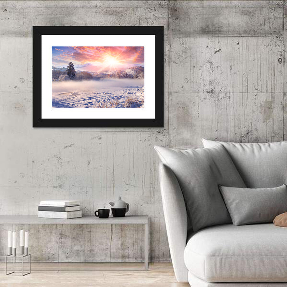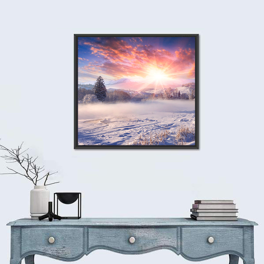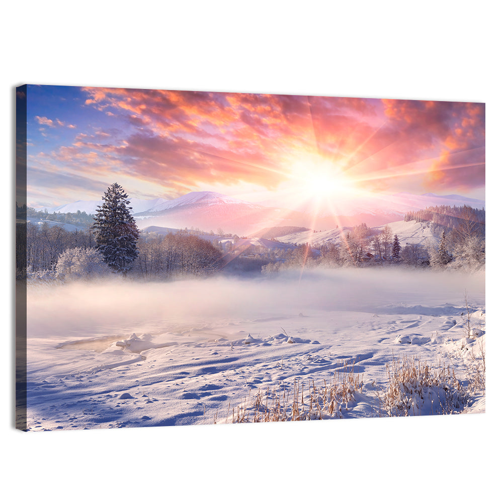 Take your love for art to the next level with this stunning winter sunrise wall art featuring a mountain village. This CanvasPiece print is sure to add a touch of elegance and warmth to any room. Captivating and thought-provoking, it's sure to become a focal point in your home.